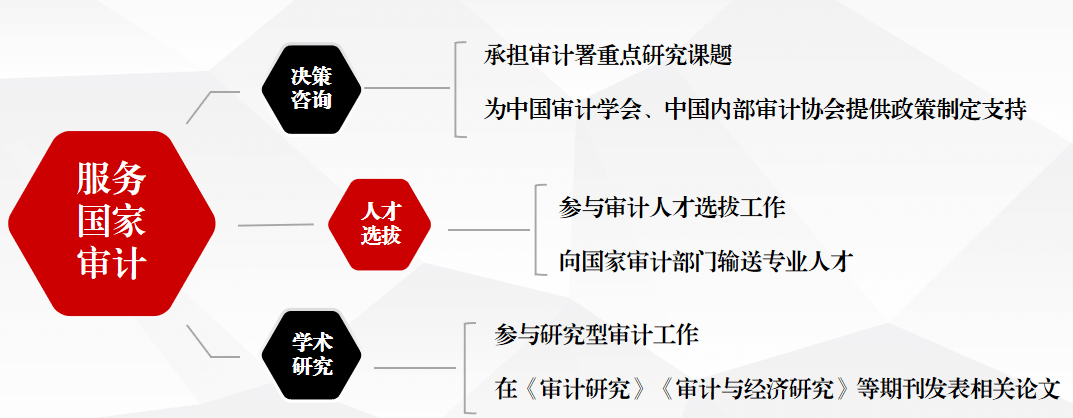 长期以来,学院坚持立足中国实践,确立了“研以致用、主动服务”理念,打造高素质专业化人才团队,为国家、北京市和行业发展提供智库服务。深入运用各类合作平台,承担审计署重点课题和中国注册会计师协会课题,参与国家审计人才职业资格与专业技术资格体系建设,承担住房和城乡建设部碳排放权审计课题。参与制定财政部碳会计核算制度、内部控制审计指南、北京审计条例、北京内部审计基础工作规范、北京领导干部自然资源资产离任审计评价指标体系等工作。为北京市人民代表大会常务委员会的审计及审计整改监督、北京市人民政府国有资产监督管理委员会监管的多家国有企业绩效考核及内部控制检查、北京地区审计人员专业能力提升、自然资源部土地资源等会计核算相关问题、中国注册会计师协会事务所国际化和新业务拓展、全国注册会计师考试制度改革等提供专业咨询服务。承办了北京市审计局主办的审计专业理论和实务操作竞赛。多渠道、多层次、全方位地融入到服务国家、地区、行业的经济社会发展中,扩大了学科影响力。